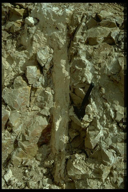 Brekziengang in Jura-Kalksteinen. Rubielos de la Cérida-Impaktbecken (Spanien); östlicher Randbereich. Man beachte die scharfkantigen Brekzien-Komponenten und das scharfkantig zerbrochene Wirtsgestein, was jegliche Karstbildung kategorisch ausschließt.